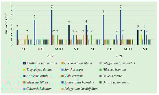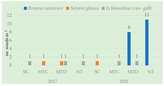 Annual dicotyledonous weeds before post-emergence herbicide, 2017, 2021. Notes: CS = Conventional System; MTC = Minimum Tillage—Chisel; MTD = Minimum Tillage—Disk; NT = No-Tillage.