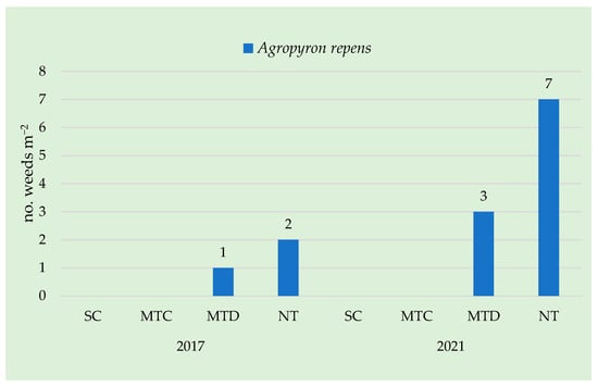 The weed spectrum was identified before the post-emergence treatment; it consists of 23 species (Table 2) as follows: 3 annual monocotyledonous (AM) species, 1 perennial monocotyledonous (PM) species, 5 perennial dicotyledonous (PD) species and 14 species annual dicotyledonous (AD) species. The AD species ranks first in terms of participation in crop weeding. After five years of experimentation, an increase in MA, MP and DP weeds was found in the MTD and NT systems.
