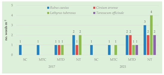 Among the perennial dicotyledonous weed species, Rubus caesius was present in all tillage systems throughout the experimental period. Cirsium arvense and Lathyrus tuberosus were identified only in the MTD and NT variants. Specific for the year 2021 is the presence of the species Taraxum officinale in the MTD and NT (Figure 4), variants where the soil has a high bulk density.