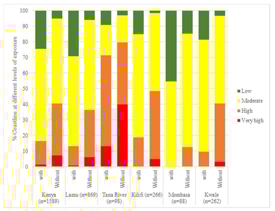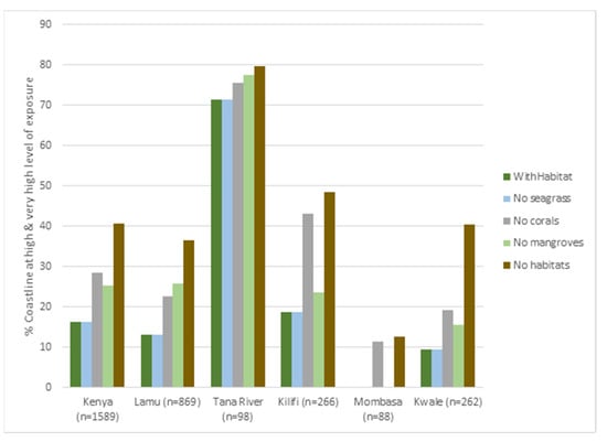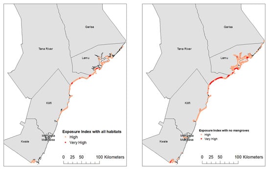 Information on the extent of habitat cover and its dynamics is important in understanding the ability of an ecosystem to provide essential services [,]. Currently, a relatively small proportion of the Kenyan coastline is at a higher level of exposure to coastal hazards when compared with other countries in the Western Indian Ocean region, such as Mozambique and Madagascar []. However, based on the results of our study, the loss of coastal ecosystems in Kenya would increase the proportion of the shoreline at a higher level of exposure to natural hazards from 16% to 41%, similar to the findings of Ballesteros and Esteves []. These authors indicated that Kenya benefits the most from the natural coastal protection offered by coastal ecosystems compared to other countries in East Africa. Results presented here indicate that corals and mangroves combined prevent higher levels of exposure to coastal hazards to around 35% of Kenya’s coastline. The proportion of Kenyan coastline at a higher level of exposure would increase from 16% to 28% with the loss of corals, and to 25% with the loss of mangroves. At the County level, coral reefs are most significant in protecting the coastline from erosion in Kilifi and Mombasa County, and mangroves are the most important in Lamu and Tana River County. This study includes the shorelines around islands and some sheltered areas and thus relatively underestimates the proportion of open coasts that benefit from the protection offered by mangroves and coral reefs.