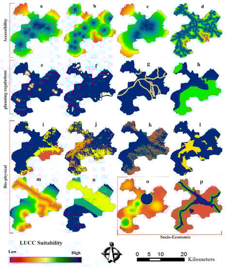 LUCC suitability analysis of driving forces due to urbanisation: (a) access to educational centres, (b) access to major cities, (c) access to entertainment centres, (d) access to the transport network, (e) industrial buffer zone, (f) existing mines, (g) rivers, (h) ecologically protected lands, (i) slope, (j) land cover, (k) elevation, (l) flood, (m) fault, (n) earthquake, (o) population density, (p) land price.