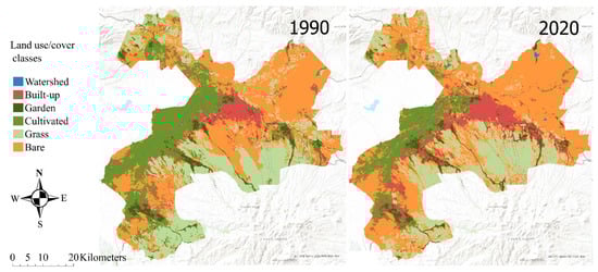 Percentage of land use classes in 1990 and 2020.