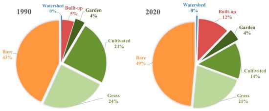 Figure 5 shows that from 1990 to 2020, the proportion of built-up land increased, whereas the proportion covered by cultivated, grass, and bare land dropped. Figure 5 shows that the proportion of the built-up has increased from 5% to 12%. Over the same time period, the proportion of cultivated fell by around 10%. Additionally, throughout this time period, bare land declined from 49% of the overall share to 43%.
