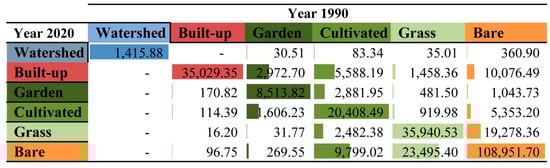It is essential to know about inter-class exchanges after analysing the LUCC’s composition and configuration pattern. Determining changes such as net decrease or rise, variation within each class, and movement across classes are all instances of change detection. TerrSet was able to discover this by comparing LUCC results from 1990 and 2020. (Figure 6). According to the findings, the highest rate of land classification shifts occurred in the cultivated category. The most notable shifts occurred when cultivated land was transformed into a built-up area (5588.19 hectares) or into bare land (9799.02 ha). Between then and now, 19,278 hectares were transformed from bare to grassland. However, the built-up areas saw tremendous growth due to the transformation of other classes. The majority of cultivated was turned into built-up. In addition, 10,076.49 hectares of bare land and 2972.7 hectares of garden land were transformed into an urban setting.