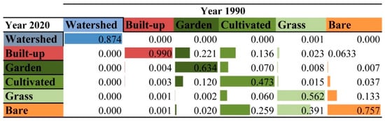 Results from the MC study pinpoint LUCC behaviour. The reasoning for modelling future probabilities is embodied in these transition potentials and transition areas. Figure 7 suggests that conversion of garden and cultivated land to urban use occurred most likely. On top of that, most likely, cultivated land was being converted to bare land or built-up area. It indicated that there was a high potential for converting cultivated into the aforementioned area. Furthermore, the transition from grassland to bare land accounted for the vast majority of the movement.