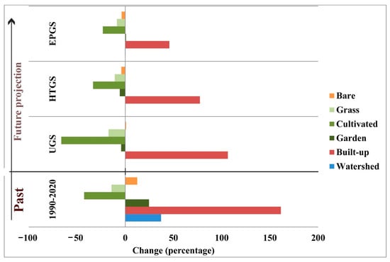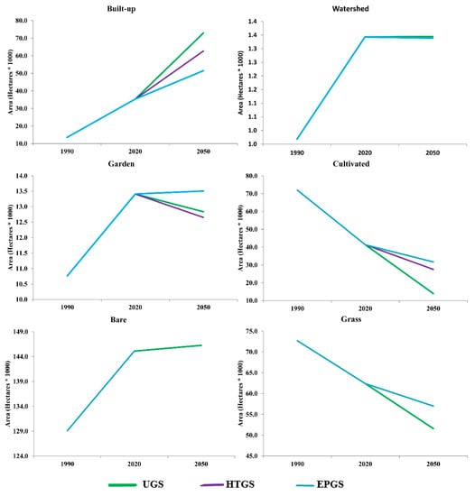 Analysing the composition of TMA indicate that this landscape will be home to significant LUCC in the future. Figure 11 displays the results of a change detection analysis, which shows that general trends are consistent across all three scenarios. The scenarios all predict significant growth in urban areas, consistent with historical patterns; however, the rate of growth in the UGS is expected to be much higher than in the HTGS and the EPGS. The pattern of cultivated land conversation is similar, but opposite. Continuing on the downward trajectory shown in the scenarios leading up to 2050, we expect the largest decreases in UGS, HTGS, and EPGS respectively. Figure 11 shows that grass land is expected to move in the same direction as cultivated land. Contrary to the historical trend, both UGS and HTGS will decrease even while garden areas continue to grow. Nonetheless, the rate of expansion will remain slow relative to historical norms. The barren terrain and watershed continue on a trajectory similar to that seen in the past but with a more constant line going forwards.