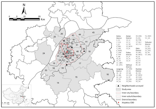 The geographic location of the study area and surveyed neighborhoods in Nanjing, China.
