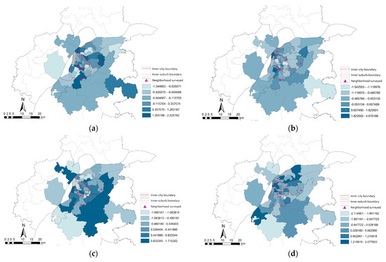 The temporal distribution of the out-of-home activities of low- and non-low-income groups is shown in Table 4. A subdistrict with a higher score means that the low- or non-low-income group uses and relies on this space more. In general, there are obvious differences in the utilization patterns of urban space among different income groups. On weekdays, the work activities of low-income participants are highly concentrated in the main city center and the space near the survey communities, while the high-value spaces are scattered. In contrast, the work activities of the non-low-income group are mainly dispersed in the urban space, and the high-value space is mainly distributed in the inner suburbs and outer suburbs. The neighborhood and the surrounding areas are the main spaces for the shopping, leisure and other personal activities of the two income groups. It is worth noting that the other-personal activities of low-income participants are more concentrated in the main city space than those of the non-low-income group, indicating that low-income people may rely more on the main urban space for their daily life.