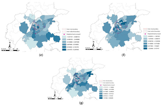 Spatial distribution of scores of seven main factors. (a) F1: Mixed leisure and low-income-other activities; (b) F2: Mixed shopping activities; (c) F3: Low-income-working activities; (d) F4: Non-low-income-working and leisure activities; (e) F5: Low-income shopping and leisure activities; (f) F6: Low-income other activities; (g) F7: Non-low-income other activities.