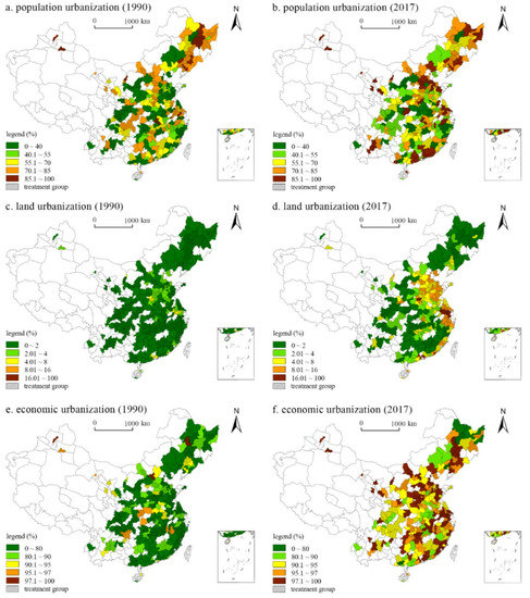 Figure 1 displays the spatial pattern of the PU, LU, and EU levels for the treatment and control groups in 1990 and 2017. From Figure 1, the PU, LU, and EU levels varied significantly among cities. The difference in the LU level between cities was the most significant, followed by PU. Additionally, the EU level was relatively balanced among cities. These reflect the complexity of the urbanization process. Therefore, it was necessary to measure the impact of DZs on urbanization from different perspectives. Overall, the urbanization level in the eastern coastal regions was observably higher than that in the central and western regions. The Beijing–Tianjin–Hebei Urban Agglomerations, Yangtze River Delta Urban Agglomerations, and Pearl River Delta Urban Agglomerations were the high-value areas in terms of the urbanization level, and the increase was the most obvious during the study period. The regional difference in the urbanization level proved that it was reasonable to divide the sample into three regions. In addition, Figure 1 further confirms that the urbanization level of the treatment group cities was higher than that of the control group cities.