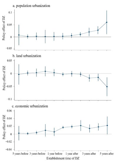 As can be seen from Figure 2, the establishment of DZs exerted an impact on urbanization. Additionally, the impact of DZs on urbanization increases significantly over time. The policy effect on urbanization in years without DZs fluctuated around the zero value. This indicated that there were no unparallel trends in the sample before the city set up the DZ. However, after the establishment of DZs, the policy effect of PU, LU, and EU significantly deviated from a zero value. This shows that the establishment of DZs exerted an impact on urbanization progress. Additionally, the treatment and control groups in this study also passed the parallel trend test. The establishment of DZs in cities significantly affected the inherent processes of PU, LU, and EU. Specifically, the DZ policy exerted an incredibly positive effect on PU and EU, while it negatively affected LU. In addition, Figure 2 showed that the policy effect of DZs on urbanization increases significantly over time. Due to this, we have reason to believe that establishing DZs can significantly change the developmental trend of the urban population, land use, and industrial industry, and these impacts will become more pronounced over time.