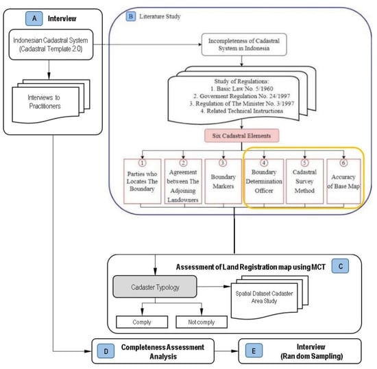 Work steps for the assessment of six cadastre elements [12].: (A) Interviews, (B) Literature & Regulations reviews, (C) Assessment of Land Registration Map using MCT, (D) Completeness Assessment Analysis, and (E) Random Interview.