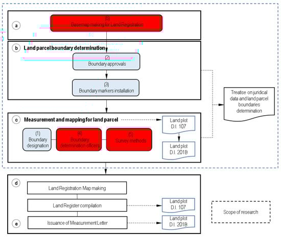 Stages of boundary determination in survey and mapping activities for purposes of physical data collection and processing consisting of legal elements (blue boxes 1, 2, 3) and spatial elements (red boxes 4, 5, 6) [12].