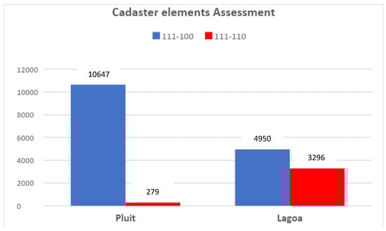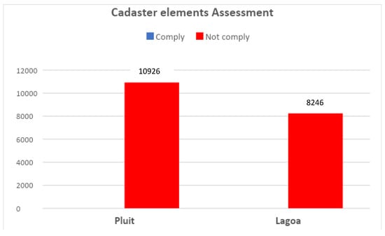 The assessment results, as shown in Figure 3 show that 100% of the spatial cadastral elements in the two study areas do not meet the survey and mapping rules stipulated in the PMNA Technical Instructions Regulation No. 3/1997 on Materials for Measurement and Mapping of Land Registration [14].