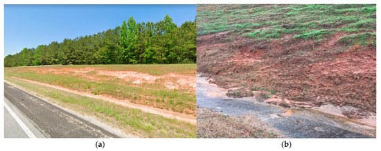 In the southeastern USA., turf grasses grown from seed are the most common vegetative erosion control [6]. These perform well on relatively flat terrain, where deep root structure is not needed for stabilization [39]. However, turf grasses require mowing. On steeper terrain, mowing can cause ruts that increase erosion (Figure 1) and may expand into shallow slope failures during rain events [4]. There is interest among transportation management agencies in finding alternatives to turf grass that would provide deeper soil stabilization while still establishing quickly and preventing surface erosion. The goal of this study is to evaluate the field performance of several candidate species in experimental plots in the Piedmont region of Alabama. This area is especially prone to shallow slope failures and erosion along slopes due to mowing activities [4,5] (Figure 1a).