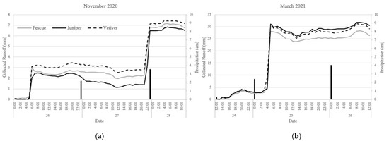 Daily precipitation and hourly change in runoff volume from three erosion plots during rainy periods: (a) six months after planting; and (b) ten months after planting.