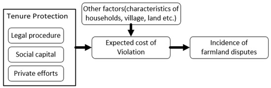 Framework to address tenure protection and farmland disputes. To determine the impact of land titling on the incidence of farmland disputes, it is necessary to explain how a dispute emerges in the first place. Usually, disputes arise after a violation has taken place [37,38], such as a tort, breach, expropriation, etc. Within a rational framework, people violate a rule only when it is profitable to them to do so [39]; that is, a dispute will not arise if the expected cost exceeds the expected benefits of the dispute.