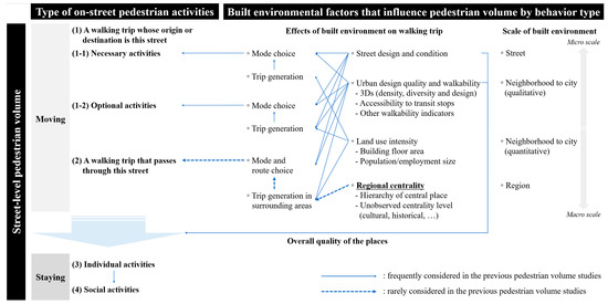 2.1. Pathways from Built Environment to Street-Level Pedestrian Volume: A Conceptual Framework