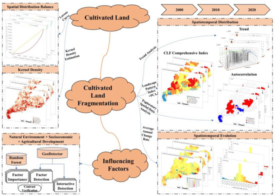 Cultivated land fragmentation (CLF) means the cultivated land plot has changed from a single, homogeneous, concentrated, and contiguous whole to a complex, heterogeneous, and divided patch mosaic [1,2]. CLF is driven by both natural and human factors and makes it difficult to carry out centralized contiguous operation and large-scale management [3]. As a typical feature of global cultivated land landscape and one of the main deterrents to agricultural development [4,5,6], CLF has a strong relationship with regional food security and global sustainable development [7]. CLF can restrict the use of agricultural machineries [8] and the construction of infrastructure [9] and hinder the centralized management and large-scale operation of cultivated land and the process of agricultural modernization and scale [10], resulting in low efficiency in agricultural production [11,12,13,14], waste of production materials [15], and increase in production cost [16,17,18]. In addition, the CLF process can seriously damage the cultivated soil, reduce soil fertility [19], lead to a decline in grain production capacity [20,21], and threaten national food security and social stability [22]. CLF can also change the regional microclimate [23,24], lead to the loss of biodiversity [25], and affect global soil carbon pools [26] and ecosystem functions [2,27,28,29]. Therefore, CLF has received extensive attention from academia and governments around the world and addressing the CLF problem has become a top priority for global agricultural policy [30,31]. Scientifically assessing the extent of CLF and analyzing its causes are key steps in promoting the intensive and efficient utilization of cultivated land resources, improving the productivity of cultivated land, promoting agricultural modernization and scale, and boosting rural development [21]. Conducting research works around this is of great significance in guaranteeing regional food security, maintaining ecological security patterns, and ensuring the sustainable development of the world.