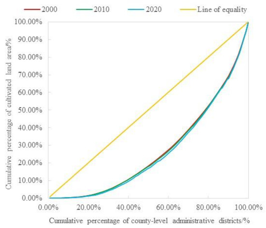 Lorenz curves of spatial distribution of cultivated land resources in Guangdong Province in 2000, 2010, and 2020.