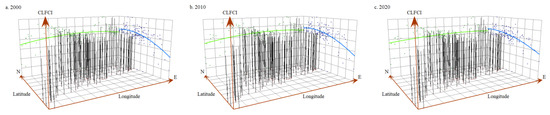 Spatial distribution trend of CLF in Guangdong Province on the county scale in 2000 (a), 2010 (b), and 2020 (c). The spatial distribution trend of CLF in Guangdong Province on the county scale in 2000, 2010, and 2020 are displayed in (a,b), and (c), respectively.