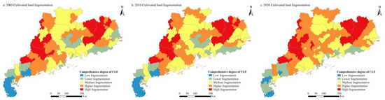 Spatial distribution of CLF in Guangdong Province on the county scale in 2000 (a), 2010 (b), and 2020 (c). The spatial distribution of CLF in Guangdong Province in 2000, 2010, and 2020 are displayed in (a,b), and (c), respectively.