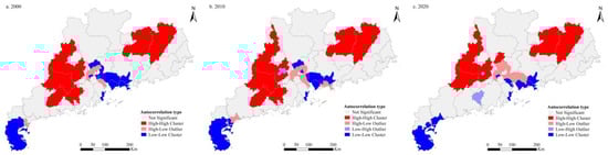 Local indicators of the spatial association (LESA) map of CLF in Guangdong Province on the county scale in 2000 (a), 2010 (b), and 2020 (c). LESA map of CLF in Guangdong Province on the county scale in 2000, 2010, and 2020 are displayed in (a,b), and (c), respectively.