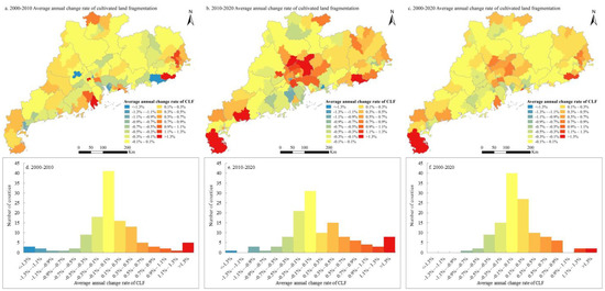 Average annual change rate of CLF and its spatial distribution in Guangdong Province on the county scale during 2000–2010, 2010–2020, and 2000–2020. The spatial distribution and histogram of the average annual change rate of CLF during 2000–2010 are displayed in (a,d), respectively. The spatial distribution and histogram of the average annual change rate of CLF during 2010–2020 are displayed in (b,e), respectively. The spatial distribution and histogram of the average annual change rate of CLF during 2000–2020 are displayed in (c,f), respectively. Colors in the histograms correspond with the maps.