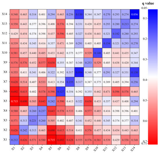 Heatmap of the interaction between factors influencing spatial difference in CLF in Guangdong Province. X1, X2, X3, X4, X5, X6, X7, X8, X9, X10, X11, X12, X13 and X14 refer to mean patch area of cultivated land, forest area ratio, altitude, slope, per capita regional GDP, construction land area ratio, proportion of industry and service industry, per capita disposable income of all residents, population density, per capita cultivated land area, urbanization rate, agricultural output value, agricultural practitioners and grain production, respectively.