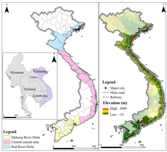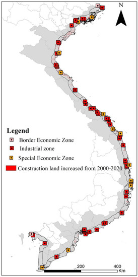 Vietnam is a typical developing but fast-growing region. In 2019, the per capita GDP was once only USD 2715, ranking 132 in the world. Since 2008, Vietnam’s GDP growth rate has remained above 5% and it reached 7.08% in 2018, making it the fastest-growing country in Southeast Asia. In addition, it additionally presents three important development characteristics: fast urbanization, continuous industrialization, and in-depth economic reforms (“opening up”). First, since 1990, the city population of Vietnam has increased by almost 21.56 million, with the percentage growing from 20.3% to 36.6%. Second, since 2000, Vietnam has transformed about 64,000 hectares of natural land to industrial land, accounting for 68% of the total natural land area converted. Third, since 1988, Vietnam’s foreign direct investment (FDI) has experienced a rapid growth trend in both the number of projects and the amount invested. As the frontier of Vietnam’s reform and opening up and representing an important engine to drive Vietnam’s economic development, the coastal area of Vietnam is much more developed than inland areas [5,6]. It is the area where human activity is the most intense [8,9]. This was a key element in our choice of the coastal zone of Vietnam as the focal point for this study.