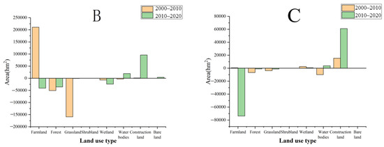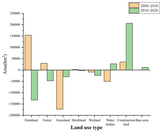 From 2000 to 2020, the region and aerial proportion of construction land in the study region expanded continually (Table 2, Figure 2). In particular, construction land area extended by 353.00 hm2 in 2000–2010 and extended by 2064.74 hm2 in 2010–2020. The proportion of construction land to total land area multiplied from 2.72% in 2000 to 4.40% in 2020. The general consistency of the area changes in the two periods suggests that they are notably reliable and can replicate the general regional trend of the land use change [56]. In addition, the natural landscape areas, such as grasslands, forests, and wetlands, decreased. Among them, the grassland area decreased over the two periods by 172,804.14 hm2 and 29,607.39 hm2, respectively. The proportion of grasslands reduced from 8.36% in 2000 to 6.95% in 2020.