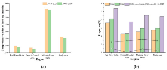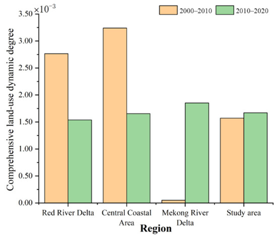 As can be seen from the comprehensive land use dynamic degree (Figure 4), the rate of change in each subregion was remarkably distinct. In the past 20 years, the areas with the greatest rate of change were in the Central Coastal Area, whereas the areas with the smallest change rate were in the Mekong River Delta. Specifically, from 2000 to 2010, the region with the greatest rate of change was the Central Coastal Area, where the comprehensive dynamic attitude index was 3.24 × 10−3. The region with the smallest rate of change was the Mekong River Delta, with a comprehensive dynamic attitude index of 5.10 × 10−4. From 2010 to 2020, the Mekong River Delta had the largest rate of change with a comprehensive dynamic attitude index of 1.85 × 10−3. The Red River Delta had the smallest rate of change with a comprehensive dynamic attitude index of 1.54 × 10−3. Notably, the variation ranges of each region were also distinct. The region with the largest variation range was the Central Coastal Area, where the comprehensive dynamic attitude index decreased by 48.95%.