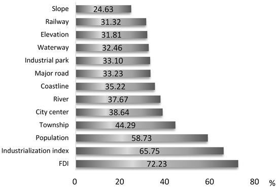 The influence of social and economic factors (human factors), particularly the continuous advancement of urbanization and industrialization, is the primary factor inflicting the continuous expansion of construction land [59]. The distance to a city center, distance to a township, distance to an industrial park, the provincial industrialization index, and the provincial FDI have universal significance, which can better replicate the role of human factors [60].
