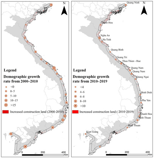 The continuous advancement and deepening of urbanization in Vietnam have driven the employment transfer direction. The continuous migration of rural populations from inland to coastal areas has resulted in the coastal region of Vietnam becoming one of the most densely populated areas in Southeast Asia. According to official data, Vietnam had a population of almost 97 million in 2019, of which about 50% was concentrated alongside the coastal area [65]. The fast boom of the population alongside the coastal area accelerated the development of housing construction, trade, and service industries, which in turn further promoted the process of urbanization. The promotion of urbanization required more urban areas and advanced infrastructure construction, which improved the rigid demand for construction land and further promoted the scope and speed of construction land expansion. Among them, the migration of rural surplus labor to big cities led to an increasing population in big cities, expanding the areal extent of construction land around big cities such as Hejing, Qinghe, and Haiphong City (Figure 8).