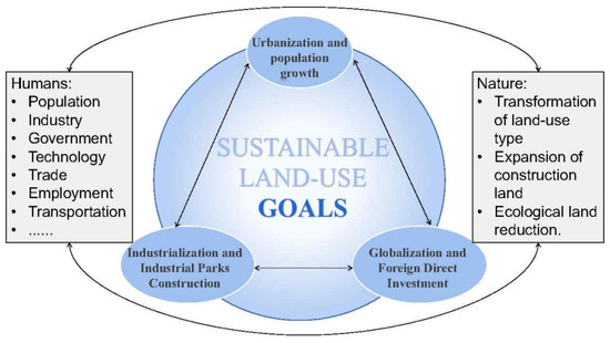 This section further discusses the mechanism of different factors on the spatial differentiation of land use in the coastal areas of Vietnam. First, we found that land use in the coastal areas of Vietnam showed a trend of continuous and rapid increase in construction land and had observable spatial variation characteristics. This observation was comparable to the existing research on hot spots with rapid development [67,68,69,70]. Specifically, the research results of this study are similar to these of other regions in Vietnam, other countries in Southeast Asia, the South China Sea, and Asia. These areas are the same as Vietnam in terms of geographical position and stage of economic development, so they also exhibit comparable development trends in land use change. The identification results of impact factors exhibit that the joint actions of urbanization, industrialization, and globalization have led to the rapid growth of construction land in the study area, which is consistent with the present research, though the influence of common human factors such as population and location factors on land use has been widely validated [71,72,73,74,75,76,77]. However, this study especially examined the influence mechanism of human factors closely associated to globalization, urbanization, and industrialization, and analyzed the coupling mechanisms among them.