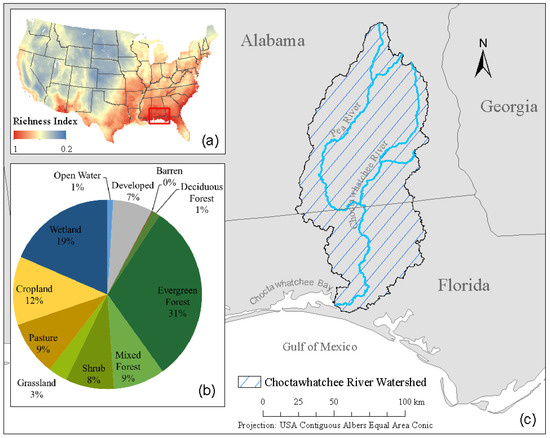 Location of the Choctawhatchee River Watershed. (a) The species richness index of the United States is shown as are where the watershed is in the United States, higher richness index values are shown as red and lower values in blue. (b) A pie chart of the proportion of each LULC. (c) The full extent of the watershed and the locations of the Choctawhatchee and Pea Rivers.