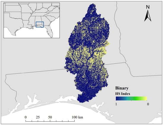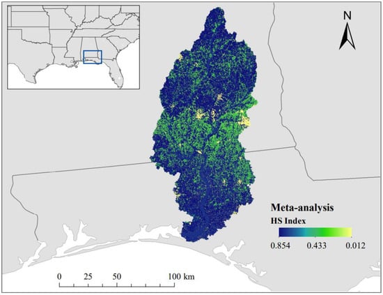 Figure 4 displays a HS map of the watershed based on the average values derived from the literature. The Alabama side of the watershed in the North generally had a lower HS when compared to the Florida side in the South. Urban areas had the lowest HS at 0.012. Urban land uses made up 6.80% of the watershed. Bare land had the second lowest HS at 0.224 and made up 0.12% of the watershed. The habitat with the third lowest HS was agriculture, having a HS near the median at 0.354. Agriculture made up 21.26% of the watershed. Overall, about 28% of the watershed had a relatively low HS.