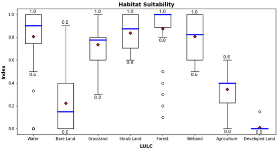 The suitability box plots for each LULC class. The whiskers indicate 1.5 times the interquartile range values. The bold line represents the median and the diamond shaped markers represent the mean. The circles are the outliers.