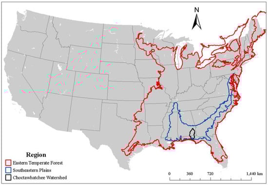 The area of interest was the Choctawhatchee River and Bay Watershed located in the Southeast United States. The watershed was within the boundaries of the Southeastern Plains ecoregion, which was in the Eastern Temperate Forest ecoregion that encompassed most of the Eastern United States. A visual representation of these regions is shown in Figure 5.