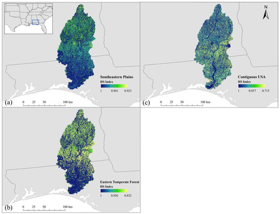 The habitat suitability maps of the Choctawhatchee Watershed based on species richness derived from averaging the values within regions of varying sizes. Maps created using the average values from grid cells in the (a) Southeastern Plains ecoregion; (b) Eastern Temperate Forest ecoregion; (c) contiguous USA.