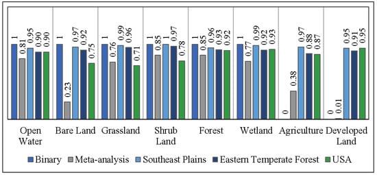 A total of 21 studies were analyzed. Of the 21, 15 studies originated in China [9,41,42,43,44,45,46,47,48,49,50,51,52,53,54], two studies were from Ethiopia [29,55], and only one study each originated in India [56], Indonesia [57], Spain [58], and the United States [19]. A total of 36 values were used to calculate the average suitability for water, 17 were used for bare lands, 30 were used for grasslands, ten were used for shrub lands, 36 values were used for forests, 18 were used for wetlands, 24 were used for agricultural, and 15 were used for developed lands. The habitat with the highest mean value was forest land. Next was shrubland, followed by water and wetlands that had nearly the same average suitability. Developed lands predictably had the lowest mean suitability.