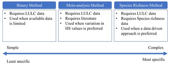 Assessing what data are available is vital when deciding on a method. The natural/unnatural binary method is used when minimum data are available. If the habitats are known, it is possible to determine whether the habitat is natural or unnatural. A list of habitats is derived from the literature or datasets. Mapping HS requires spatial data. Research goals may require the HS values to be more exact. Using 0 and 1 for unnatural and natural, respectively, would be too broad. Expressing variation between the HS of different habitats requires expert knowledge of the target region. The literature review method is used when there is no access to expert knowledge. A literature review is used to synthesize the results of multiple studies [59]. Existing literature is needed to perform a literature review and gathering results from similar studies is preferred [60]. HS indicators such as species richness are used in a data driven approach. Using an indicator requires available data for the study region or a similar region. Indicators that are used for this are biophysical, socio-economic, or management attributes [61]. The characteristics of each landscape were studied to determine an indicator that could be used to model the suitability across all landscapes, which included the biotic and abiotic components of deciduous forests [62], evergreen forests [63], mixed forests [64,65], wetlands [66,67], shrub lands [68], grasslands [69,70], and bare lands [71,72]. Species richness was used as an indicator to estimate the overall health of any habitat and to identify priority conservation areas [73,74,75].