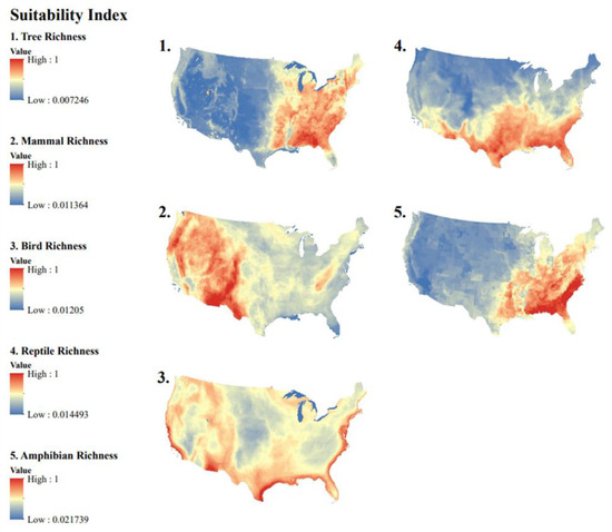 When looking at suitability maps made from individual species group richness (Figure 9), tree richness had the highest range of index values. Despite the index values, the range of bird species was the highest, with the lowest being three species and the highest being 249 species. The distribution of values in the total richness index map (Figure 1a) was most influenced by the number of trees and birds. This means that areas in the Southeast United States and along the coasts had the highest biodiversity. The distribution of species did not seem to be driven by general land use types, but rather a combination of climate, terrain, and other factors.