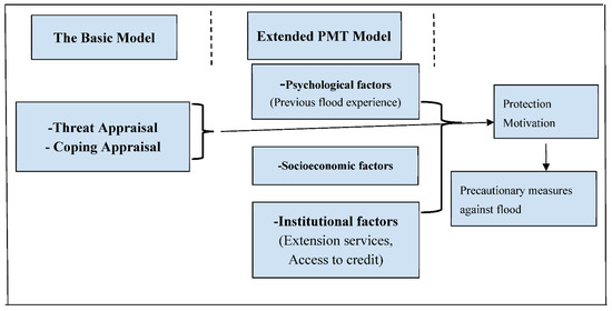 The empirical methods that have tried to characterize the determinants of flood adaptation can be grouped in three main classes: the socioeconomic model, the protection motivation theory (PMT), and coupled agent-based model (ABM). The socioeconomic model states that the social, economic, and demographic characteristics of households, such as age, sex, education status, marital status, income, family size, and farm size, determine their adaptation decisions to private prophylactic measures to flood incidences. However, it is limited in power to better explain the adaptation decision of households since it presumes adaptation decision as a matter of material welfare. Protection motivation theory (PMT) was first applied in psychology, and it is attributed to Rogers, who developed it in 1975 [35]. Its flexibility allowed it to be adopted in the study of the reasons why individuals adopted or not any measure against any natural hazards such as flooding. The first application of the theory in adaptation decision was made by [12]. The greatest strength of the protection motivation theory was its capacity to combine the variables of the socioeconomic model and psychological variables together. Above all, it assumes that adaptation decision is a matter of behavioral change and this, in turn, depends on individuals’ psychological conditions [12]. The theory also assumes that the role of socioeconomic conditions of individuals is not to directly enable adaptation decisions but to result in the behavioral change of individuals to take adaptation measures. The theory, therefore, has now two elements in it: the traditional (basic) model and the extended version [29]. The following figure (Figure 1) shows how the entity of the PMT model is enlarged.