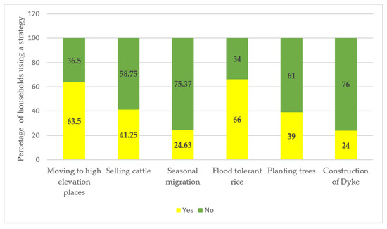 Household heads were prompted about their adaptation mechanisms to the frequent extreme flood incidence. They reported that they either used the combination of measures or sometimes just one measure. One way to reduce the agricultural damage of flooding was to plant a flood-tolerant rice variety on their farms (66%). They also shifted their movable assets and properties and families to high elevation places (63.5%) until the inundation level decreases. Where the flood incidences were high, households took temporary migration (24.63%) to safe places as an alternative method. In addition, households also reported selling cattle (41.5%), planting trees (39%), and the construction of a dike (24%) as flood adaptation measures. Figure 3 below shows the major adaptation strategies and the percentage distribution use by households.