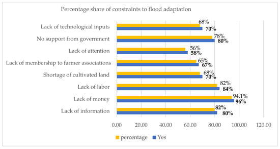 As it is clear from Figure 2 above, non-adopting respondents reported that lack of money (94.1%), lack of labor (82%), lack of information (80%), lack of support from government (78%), shortage of cultivated land (68%), lack of technological inputs (68%), lack of membership to farmer associations (65%), and lack of attention (56%) were the major constraints that hold them back from adapting to flood hazards. Since the constraints are critical issues to tackle the negative effects of flooding on the socioeconomic conditions of households, stakeholders should not overlook the role of these variables in their endeavor to flood mitigation and adaptation.