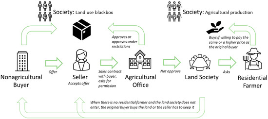 Within the law, farmland transactions proceed as illustrated in the example in Figure 1. After an offer is accepted, a purchase contract between the seller and (a nonagricultural) buyer is created. This contract is sent to the agricultural office, which checks that the contract is in accordance with the land transaction law. If there are no concerns, the buyer can acquire the farmland, possibly with some conditions attached by the agricultural office. If the agricultural office has concerns, the buyer is prevented from acquiring the land at this first stage. This might happen, for example, if the buyer is not a farmer or quasi-farmer, and there is a residential farmer who is willing and able to increase his land holding. In such a case, the responsible land society buys the farmland, which is then resold to the residential farmer [43]. Hence, the farmer is paying the ground transfer tax twice, which requires a willingness on their part to pay a price that is equal to or higher than the original price plus the tax. When a residential farmer buys farmland, it is assumed that this is for the purpose of agricultural production. This implies local food production and is regarded as positive for society. If no farmer is found, and the land society does not express an interest, the original buyer receives the land or the seller has to retain it. A potential nonagricultural buyer might lead to more uncertainty about what will happen to the farmland in the future. Possible scenarios include a rental contract with a local farmer, renewable energy installations, changes in use to build the land, and allowing the land to lie fallow or to be used for horse-keeping. This implies a “land use black box” for society.