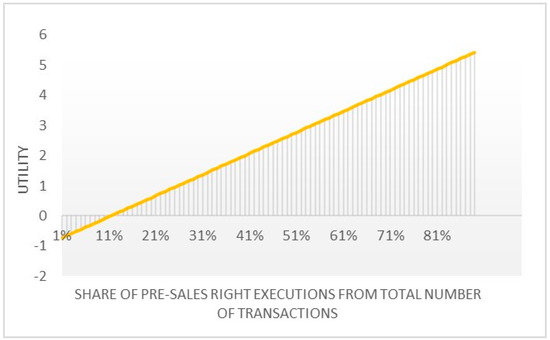 Given with a change in and , respectively, we can generate the utility function for this example, as shown in Figure 3. Setting Equation (2) to zero, we obtain the level of executions, in this case with the presale right exercised, which causes the utility of the land transaction law to change to zero. In Figure 3, is set to 10%. The intersection with the x-axis represents the minimum share of presale right execution that could be necessary to generate a positive outcome for society. Under the weighting in our example, 12% of all farmland transactions would have to include the execution of the presale rights. If the percentage is smaller, the costs of the law in terms of administrative work and established institutions are higher than its value. In the case of a higher percentage, the utility of the law becomes positive. The actual percentage of presale right execution , related to the total number of transactions, was 0.66% in 2018 [44], which appears low compared with the administrative workload required to implement the law.