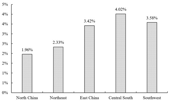 Due to the country’s large size, climatic conditions and economic development levels vary greatly between regions in China, which may lead to differences in the rice harvest losses in different regions. Figure 1 shows that the most serious rice harvest losses occurred in the Central South, with 4.02% of the total harvest lost during the harvest stage. Comparatively, the rice harvest losses in Northeast and North China were low, with rice harvest losses in these two regions of 2.33% and 1.96%, respectively. The reasons for these regional differences in rice harvest losses are as follows. The agricultural infrastructure and technical conditions in Northeast and North China are mature. In addition, compared with the plains topography of Northeast or North China, the geomorphological forms in Western or South China are complex and not conducive to harvesting operations.
