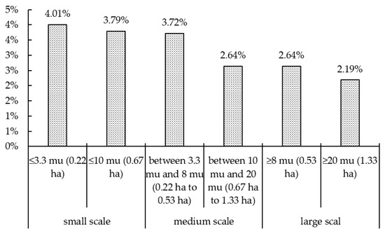 In addition, we divided the farms into three groups: large scale, medium scale and small scale. The results show that as the scale increased, the rice harvest loss exhibited a downwards trend (Figure 2).